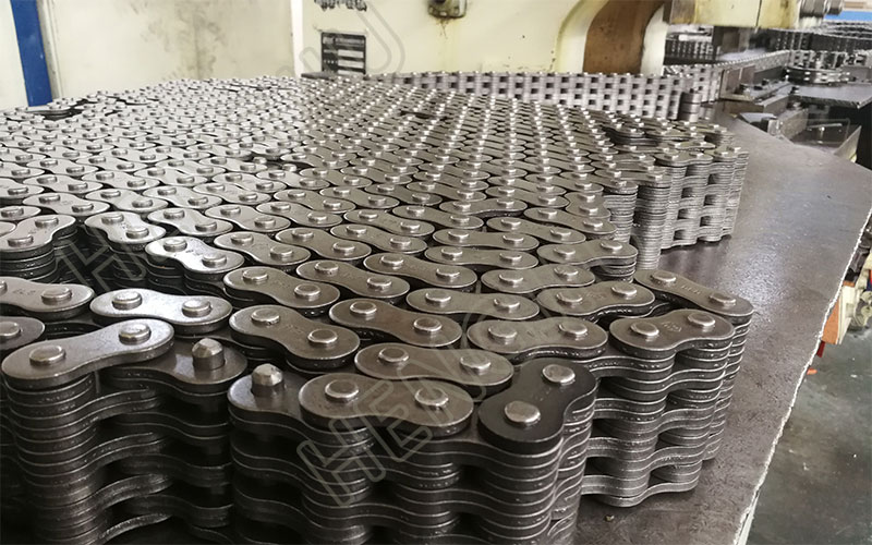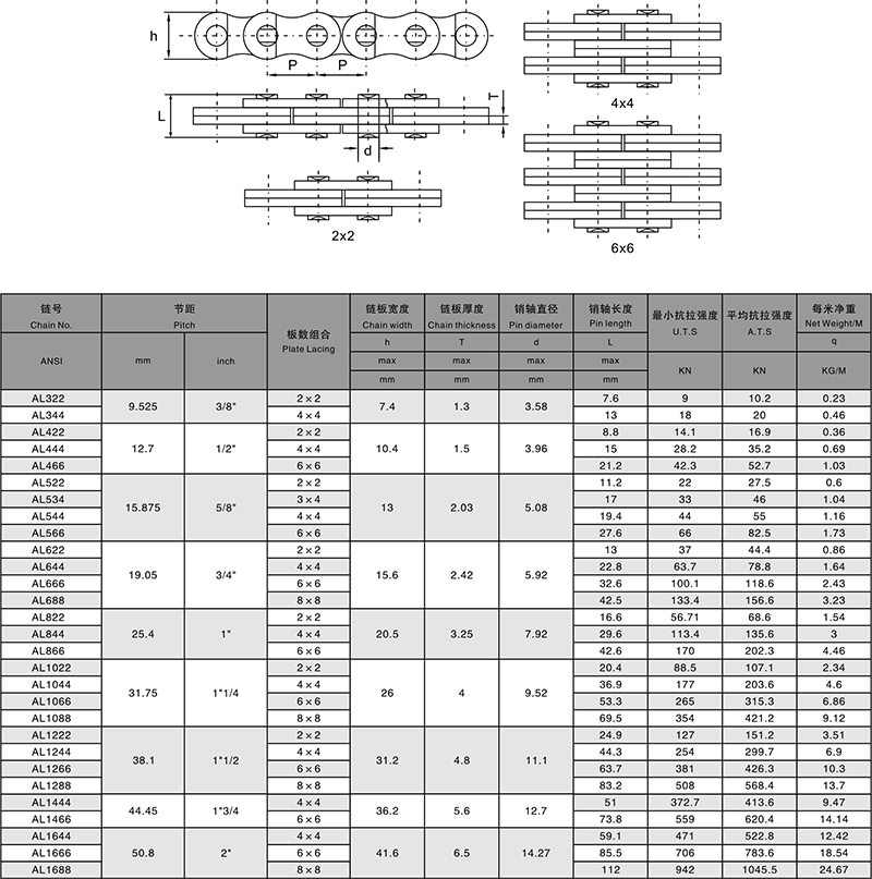 板式链是由多片链板与销轴组合而成,这种结构决定了板式链相比于其它链条,具有更大的强度/重量比,承载能力大,承受冲击能力强,维护简单。